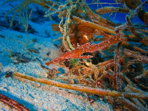 流れ着いた草木の中に擬態して隠れていますよ。