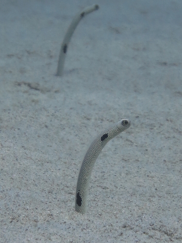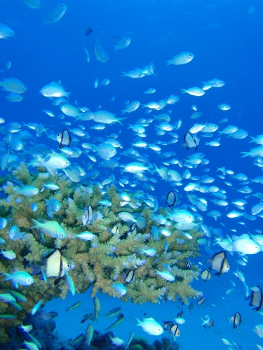 白い砂地にポツンとサンゴ。そのサンゴにはデバスズメダイがドワっと生息しています