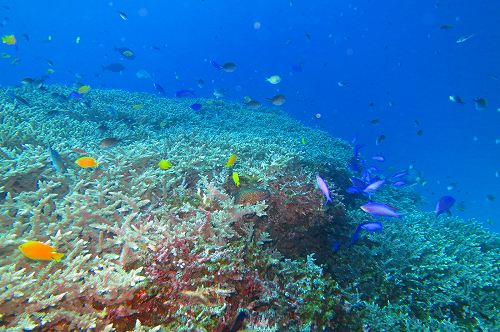 エダサンゴに群れる魚達も水温が上がってきて動きが活発になってきましたよ!