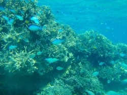 さて、調査当日の2月4日はとっても良い天気♪ これでは北風の影響が分かりにくいなぁという 嬉しい誤算もあるのですが暖かいって事に単純に喜んでしまいました。午前中はインリーフのポイントで シュノーケリングや体験ダイビングにどうかな?という提案のあった場所へ。ここは水深がすごく浅いのでタンクを使わずスノーケリングで調査することに。