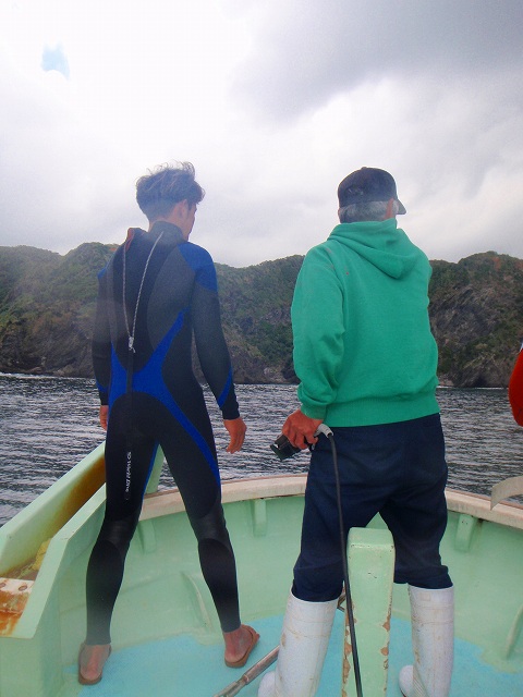 港から20分以上かけて辿り着いた最初のポイント。ここはダイナミックな地形が売り。豪快なクレバスやドロップオフ、水深25mで横に伸びる横穴。渡部は「大きなイセエビがワサワサ居るっ」て他のスタッフに教えてたみたいです。そうかと思うと土門の目の前ではぽこっとえぐれた岩穴から65cmくらいのロウニンアジが飛び出してきました!あまりの動きの速さに写真は撮れなかったんですが ドキドキしましたね~。