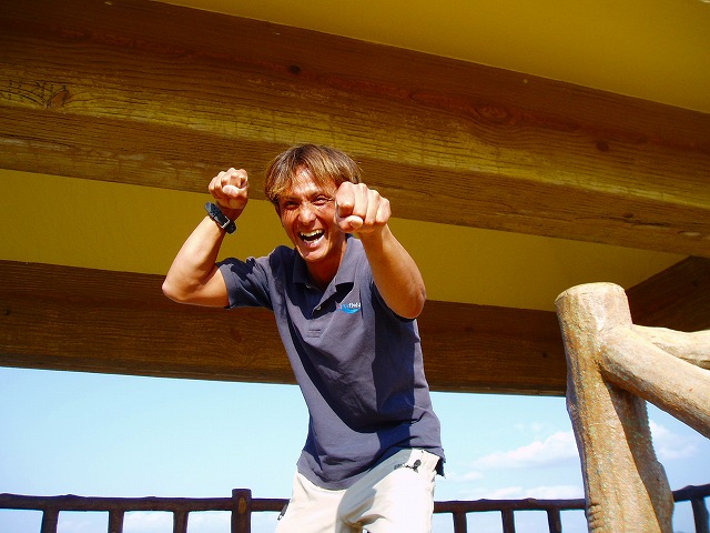 と行きたいところですが、その前に、真栄田岬の海をバックに記念撮影。