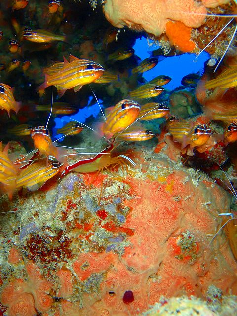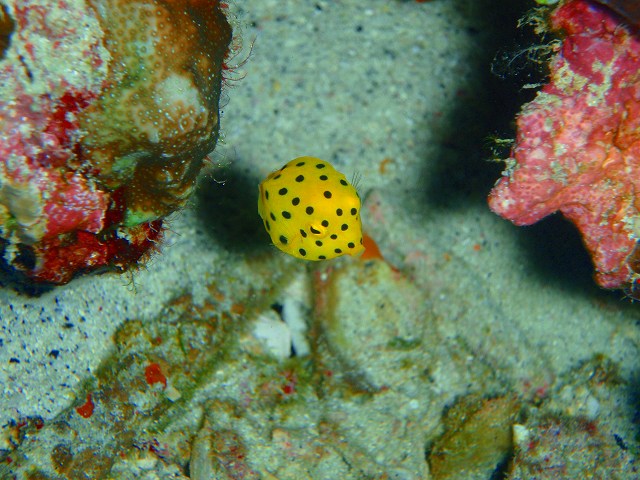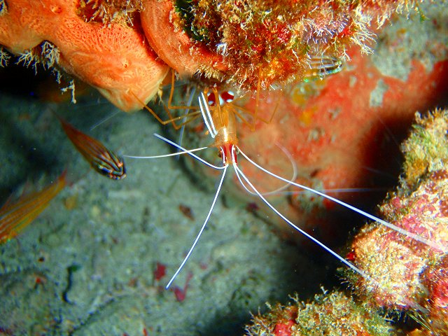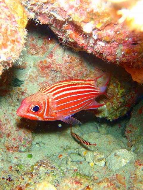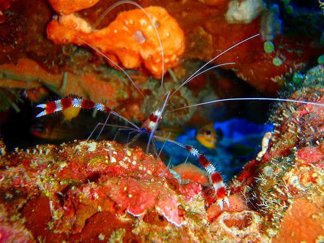 ハナダイの根ではここの主役、ケラマハナダイの群舞にうっとり(していたのは僕だけで)お客さんは写真撮影。ガーデンイールやミナミハコフグなどのかわいい魚たちは勿論のこと、今日は甲殻類も攻めてみました。