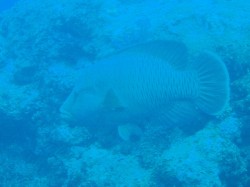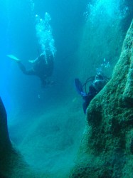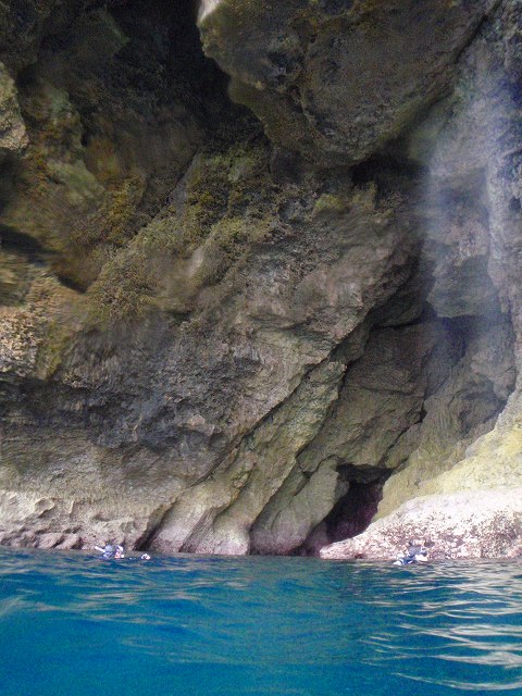 右の写真では水面にダイバーが顔を出しているの分かりますか?「波も流れもないから浮上してこの迫力を体感しよう」という事になり一旦浮上したところです。ホント大迫力ですよ。普通の観光では見ることのできない景色の一つだと思いませんか?