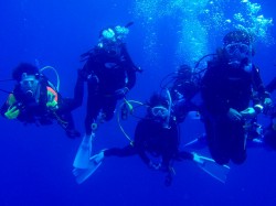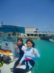 皆さんデジカメを片手に次々にエントリー。粟国・渡名喜のダイビングでは当たり前ともいえるほどの光景ですが、そこは皆さんこだわりのある人も。ワイドレンズやフィッシュアイレンズを付けた人もいます。飛び込む前から盛り上がってる感じが伝わってきますね。