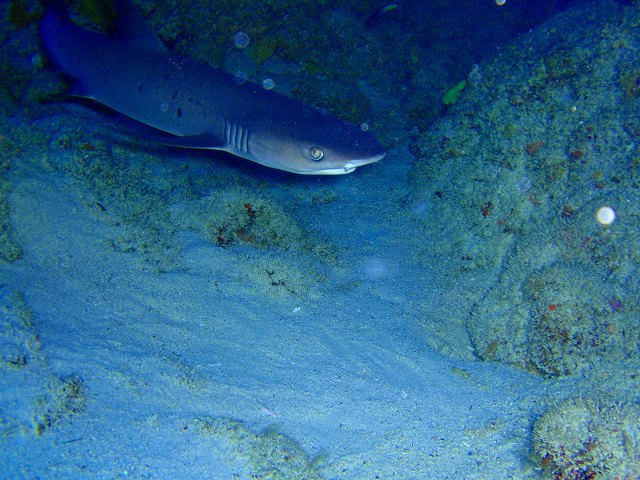 そして別の場所。「ここに居てくれー」って念じながら覗き込んだら・・・いました。チョット小さめのが1個体。でもビックリしたのかグルグル泳ぎだしてしまって お客さんはちょっと怖かったみたい。おとなしいサメなのでいたずらしなければ大丈夫なんですよん。スキルもバッチリ決めて見事認定とあいなりました。
