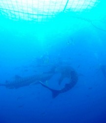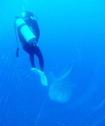 網の中にはいるのは、さすがに初めて。ゆっくりと先行して、網の上で、落ち着いてからいざ、ジンベイのもとへ潜降です!!