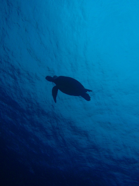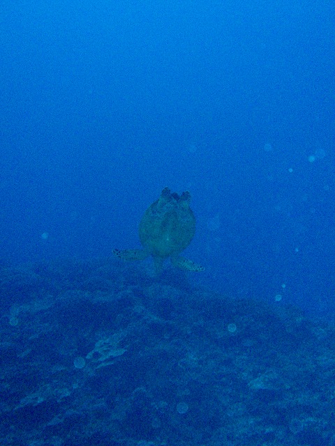 その後、根の間を泳いで生物を観察し、そろそろ、船に戻ろうとしていたら、今度はアオウミガメ登場!