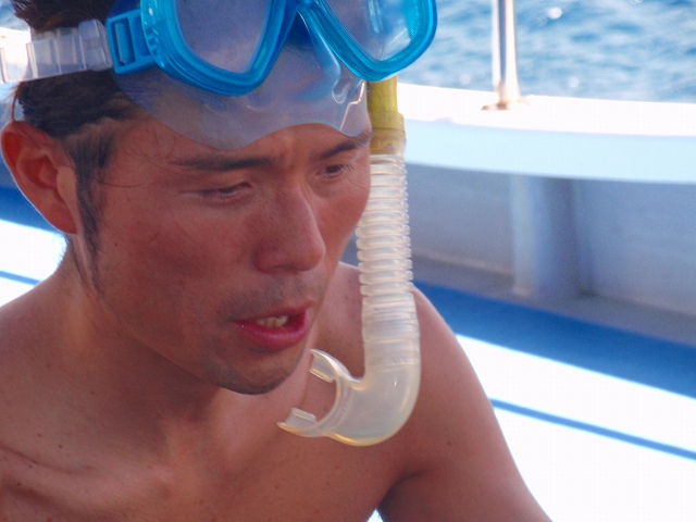 このあとマスクをつけシュノーケルを咥えて いろいろ説明していたら風になびいた髪が口元に。