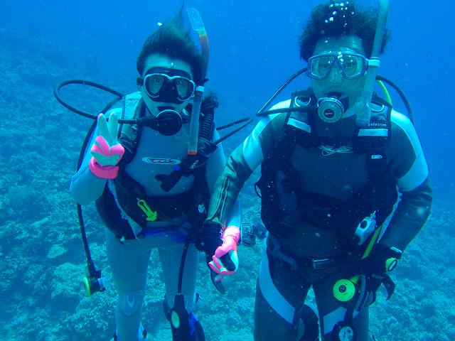 お二人は、水中でも余裕の表情。カメを見たり、たくさんの種類のサンゴを観察したり、初めてのダイビング、満喫していましたよ。