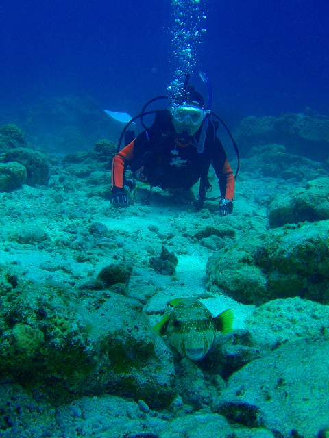 こちらは、安全停止寸前にゴロタの上でのんびり休憩中のサザナミフグとの2ショット。
