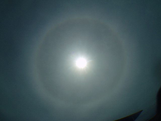 上は、肉眼で見た感じの写真。太陽の周りには、「日暈(ひがさ)」という現象がおき、まーるく光の輪で太陽が囲まれていました。とてもきれいでしたよ。そして、右は、今日のブルーフィールド・チーム。みんな上を見上げています。