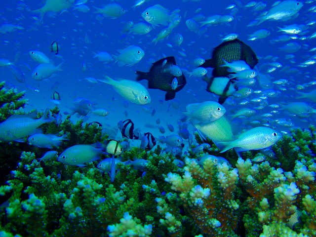 カクレクマノミや、クマノミ。ひょこっと顔を出しているガーデンイール。それから、サンゴの根に集まる美しいデバスズメダイの群れも観察してきました。デバスズメダイたちは、幼魚も入り混じってキラキラときれいでしたね~♪