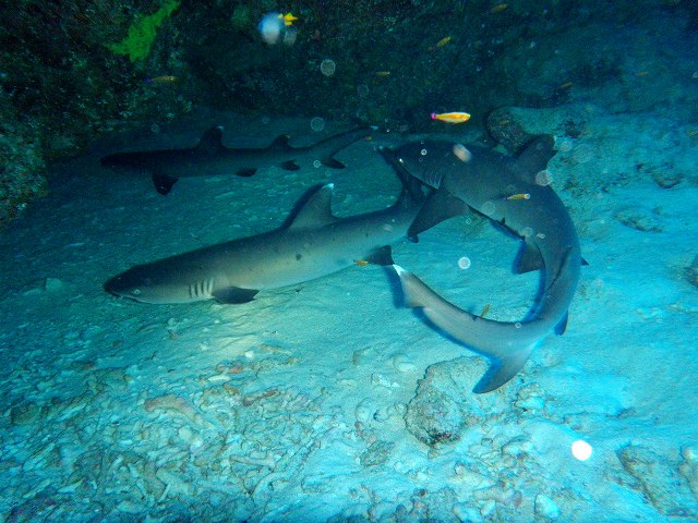 真っ白な砂地に癒されながら、カメラの相手は“テンスの幼魚”です。じっくり粘っていましたね~!!続いて、ネムリブカ。予想以上にたくさんいてビックリ!!