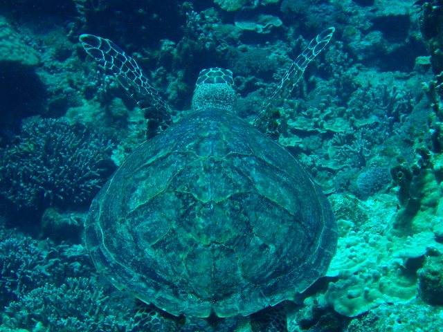 ポイントに船を停めようとしていると、水面にカメが呼吸をしに来たので、「カメ、カメ!」と指をさしながら、叫んだのですがが、講習チームは、念入りに準備中。。。水面に来たカメは見なかった(^^;とのこと。