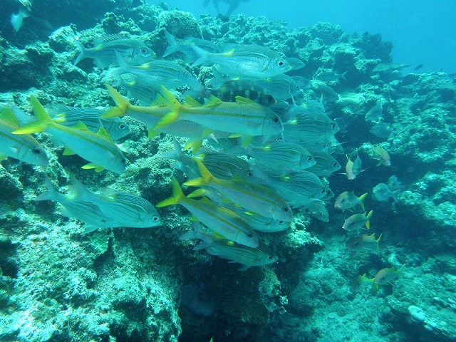 同じ湾の北側から、タートルリーフ・タマナーファーム・サンドトライアングル・カミグー・タマルル・・・と名前がついています。しかし、船が出航してくる地域(那覇や北谷、ケラマなど。。)や人によってダイビングポイントの名前は違っていたりして、「カメ吉」というポイント名を使うところもあります。まあ、要は、カメがよく見られるのです。今日も1本目も2本目もしっかり見てきましたよ~♪渡部チームはサメも見ていたようです。マダラトビエイもときどき出ますよ。