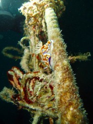 右へ行くと、砂地の真ん中にある漁礁(ブイにネットがついたもの)にレアな生物がついています。最近ではニシキフウライウオやピカチュー君(ウデフリツノザヤウミウシ)、ツマジロオコゼや、オオモンカエルアンコウなど。それから、「山田のアイドル」、トウアカクマノミ君。なかなか他の場所では見られないクマノミなので、ぜひ。トウアカクマノミの住んでいるイソギンチャクにはアカホシカニダマシやイソギンチャクエビがついていて、マクロが楽しめます。ずいぶん前でしたが、ここではセミホウボウを見たりもしました。いつも、山田で潜ると、「今日はどんな発見があるかなー」と楽しみです。