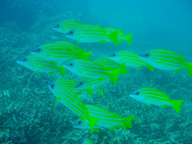 そして、キレイな砂地がパーッと広がります。ゆっくりなだらかな砂地を降りていくと、メインのエリア。左へ行くと、比較的浅いエリアにユビエダハマサンゴの群生が広がっていて、様々なお魚が群れています。とにかく魚の種類と数が豊富で、フィッシュウォッチングには最適