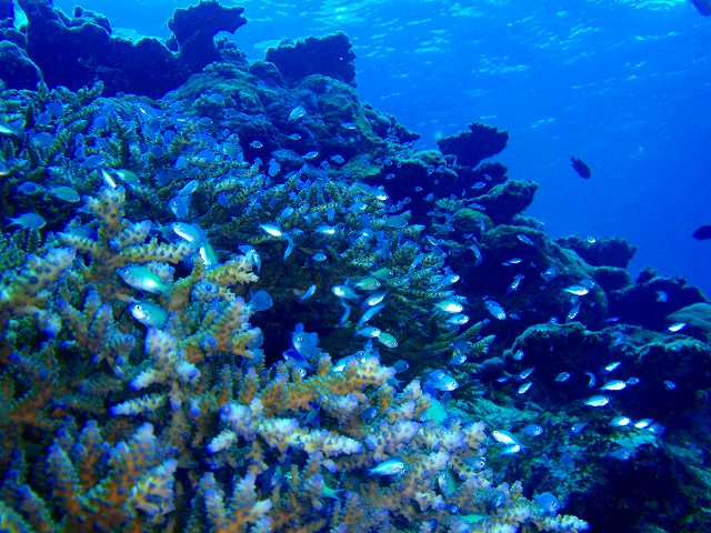 まずは、地形にサンゴとマルチポイントのヒージャーベイ!!沖に出ると、ハナゴイやグルクンの群れがお出迎え♪透明度も良くて気持ちいい!!安全停止はサンゴを見ながら?ぐるっとくぐれる穴を抜けると浅瀬にサンゴが広がります♪