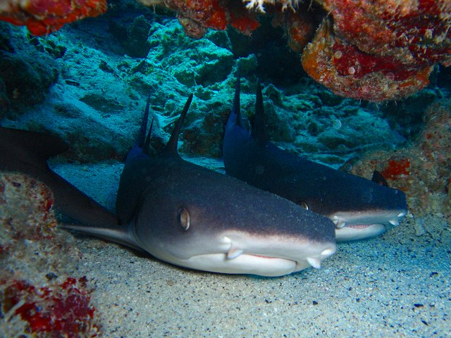いつもの場所にいてくれました♪ホワイトチップシャーク(和名はネムリブカ)。ちらっと横を見ると別の個体がふらふらと泳いでるっ。じーっと眼でおっかけてたら もう一つのいつもの場所に落ち着いてゆきました。 ビデオで撮るならそっちの方が撮りやすい。 みんなで移動してじっくり撮影してきました。