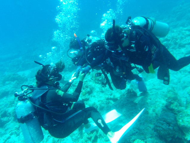 ダイビング後「印象に残っている生物は?」の問いに対して皆さんそれぞれの答えが返ってきてました。カクレクマノミやハナビラクマノミ。デバスズメダイの群れを押さえて「ガーデンイール」「スカシテンジクダイ」の名があがるとなぜか嬉しくなっちゃいます。みんな自分の感性で海を楽しんでいるんだなぁって。