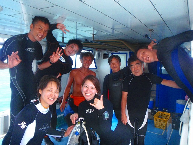 午前中は、ソフトコーラルを眺めながら、それぞれに目的を変えて潜ってきました~!!グリーンマーカーには、未だ痛々しい不発弾処理の跡が・・・。しかし、そこに群れるスズメダイはとっても綺麗♪でも、まだいるかなぁ~・・・と探したカエルアンコウ君には出会えず・・・