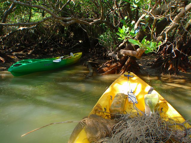 カヤックをしながらも、取れる範囲では取っています。しかし、普段、届かないところのゴミも今日は、上陸して取ってきました。泥にかぶりほとんど目立たなくなっている布や網など、ペットボトルや缶などを回収してきました♪回収しながらもいたるところに、キノボリガニやシオマネキなどのカニ。なんと、マングースも今日は登場。今日も、沢山の生物に会うことが出来ました。自分達が、綺麗な比謝川でのカヤックを楽しむためだけではなく、ここに住む生き物たちの為に頑張ってきました!!