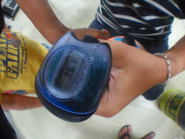 手に持っている機械(アナライザー)で使う前にも酸素濃度のチェックです!