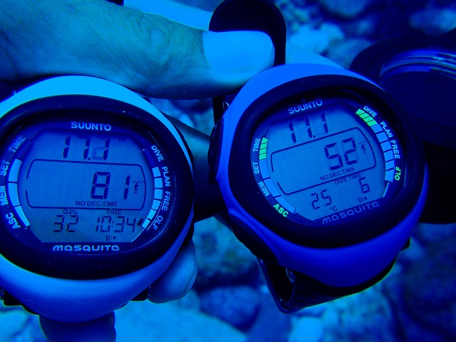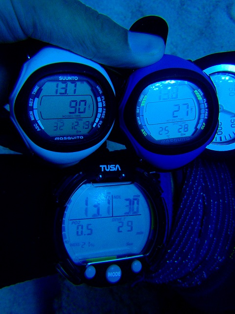 僕のDCが表示した水温は26度。まだまだ十分暖かいですね。 ナイトロックスモードに切り替えたモスキート(白)、エアモードのままのモスキート(青)、IQ700の3台を陸でのプランモードや水中での減圧不要限界を見比べたりしながら潜ってきました。