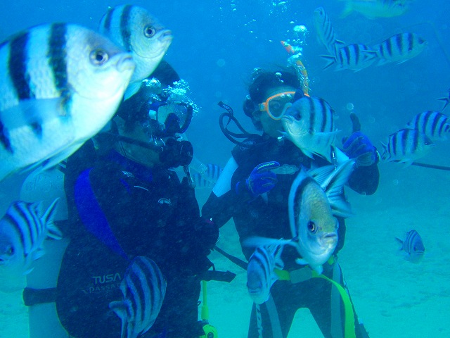 潜降したら たちまちロクセンスズメダイに囲まれます。 お二人にとってはとりたてて珍しい魚ではないけれどさすがにこれだけの数が集まってきたら うれしいですね~~♪