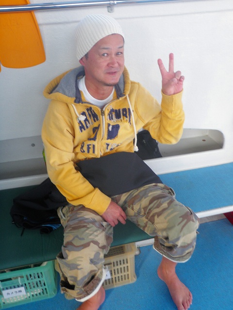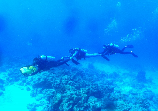 なんと、2台の水中スクーターを持参してきたお客さん。はじめての人もいたのですが、1本目は皆でチャレンジしましたよ~♪透明度もよくスクーターでいつも以上の範囲を潜ってきました!!見てください3人乗りです!!