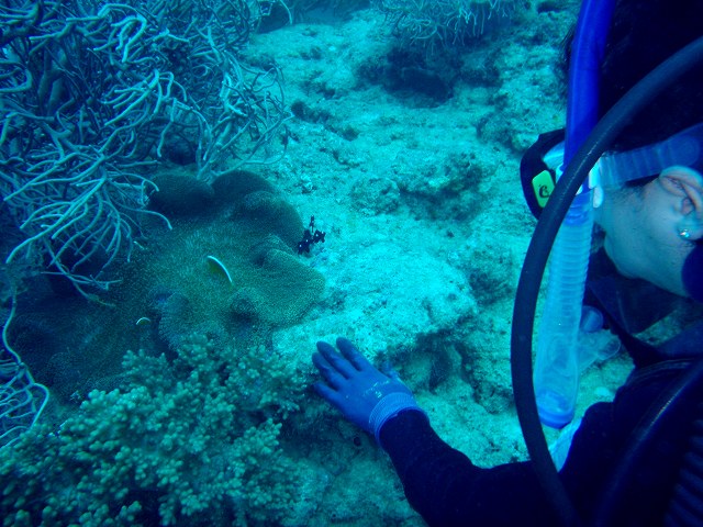 朝から、緊張しっぱなしでした。普段は、ボディーボードで海には慣れいたので、余裕が出てくるまで時間はかかりませんでした。でも普段の海と違って、透明度が良く、下が丸見えで少し怖いと言っていましたね(笑)練習をしてからエントリーです♪耳抜きなどのやり方には、少し戸惑いましたが、ゆっくり慣れながら潜っていきました。はじめは魚にあまり近づかなかったのですが、近くで見れるとわかったとたんじっくり観察していました。綺麗なクマノミなどのスズメダイやソフトコーラルを楽しんでいました♪ナマコやウミウシにも興味心身でしたね~♪『生き物をこんな近くで、見れるんですね~!!』と感動してくれました♪沖縄での予定が合えば、また一緒に楽しみに行きましょうね!!