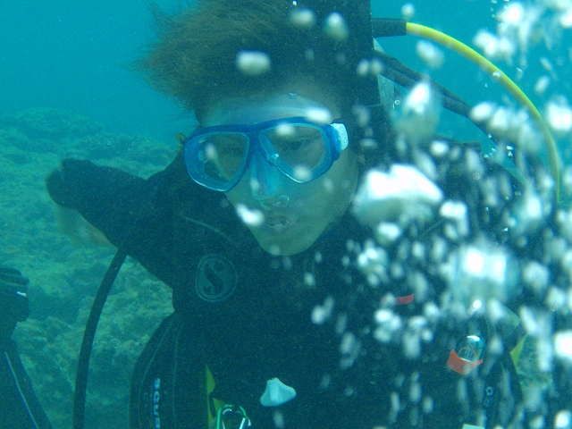 最初、「なんかデカイのが来る!まさか噂のサメ?」と警戒したんだそうです。そのうちに横に大きい事に気がつき「マンタか?」と気になり観察モードに入ったら「マダラトビエイ」だったのだそうです。自分だけ見たって言っても信じてもらえないからと周りにいた人にとにかく知らせて証人を増やしたとの事。 朝からラッキーな始まりだったようです。