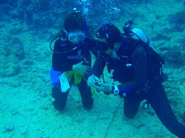 意外に座学も多いIDCですので「やっぱ、海は良いわ~~~♪」という声が出るのも当然かもしれません。ひょいと足元を見てみると真面目にプレゼンをしているボク達の足元にツマジロオコゼが。講習で潜ってても、気になる生物の方から近づいて来てくれるようです(笑)