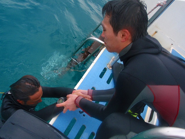 船への引き上げ方法にはとってもてこずりましたね。水野船長と協力し無事、救出終了!