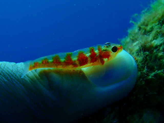 そうそう安全停止の時にロープに掴まっていたら 僕の親指にガラスハゼがピトっとくっついてました。