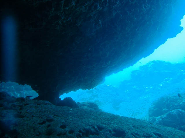 潜行すると、大きな穴があって、そこを通ってドロップオフの壁に出ます。すると、眼下には大きな岩がニョキニョキと立っていて、豪快。