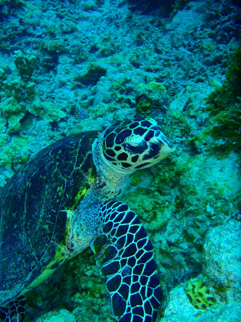 ユビエダハマサンゴのキレイなところや、ミドリイシを眺め、魚のウンチのシーンや(お食事中の方、すみません 汗)、ウミウサギの三匹の合体シーン?を見ながらカメ探しをしました。