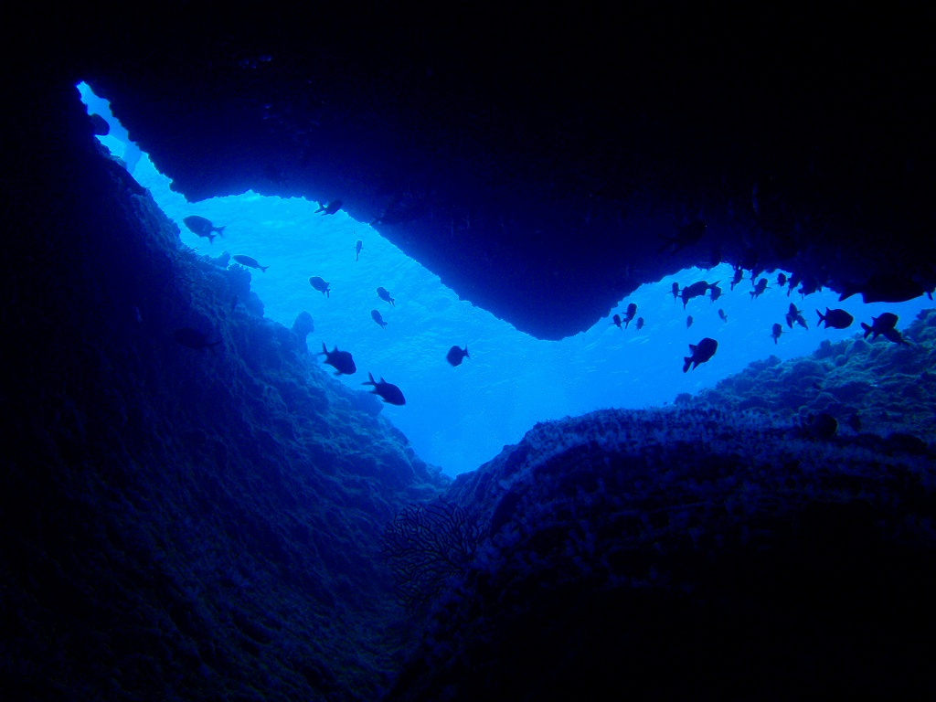 ぐーんと落ちるドロップオフには、通り抜けられる穴があり、透明度のよいときは、穴から外がきれーいに見えて、格好のワイドアングル・ポイント。