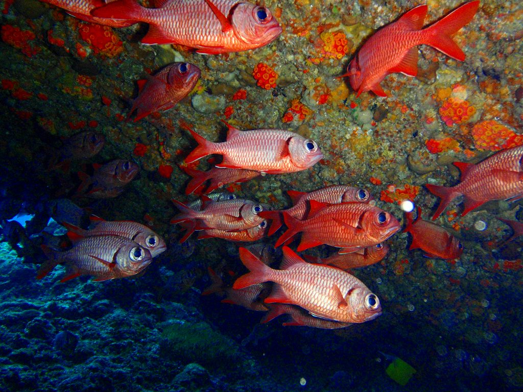 穴の中には、暗いところに住む魚、アカマツカサがたくさん群れていましたね。