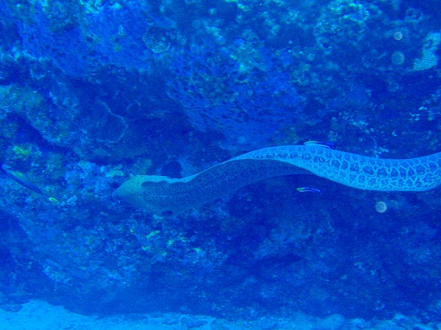 ホワイトチップシャークを激写だ!と根を渡り壁沿いを泳いで行った先で 僕らを待っていたものは でっかいドクウツボでした!