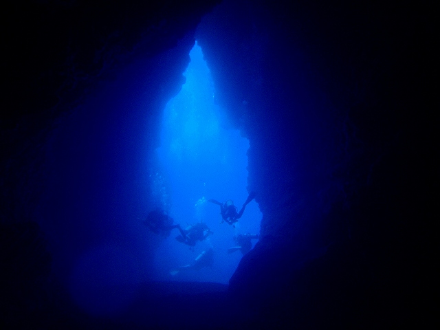 続いて「ブルーホール」島尻崎ホールとも呼ばれるこのポイントは、名前のとおり出口が青く見える洞窟がメインで、水深16mの小さな入口から入って、中で広くなった洞窟で2手に分かれます。入り口から見て右に出るショートコースと