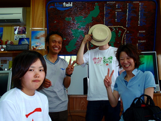 さて、一方ビーフラップの方はというと 近海で五十嵐担当にて体験ダイビングです。水中での写真は無いのですが 帰ってきてから皆で記念撮影しました。若干1名帽子で顔が見えないですけど・・・