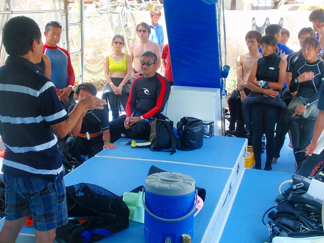 ポイントに到着すると、まずは、全員に水野からサンゴの産卵のブリーフィングです。