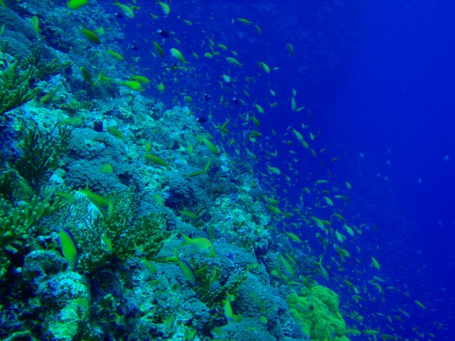 10メートルの浅瀬の棚からドロップオフを覗き込むと水深50メートルまで落ちこんでおり