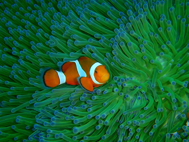 その後、野崎ではワイドにマクロに、魚影の濃い大きなサンゴの根や、クマノミ撮影にべったり張り付いたり。
