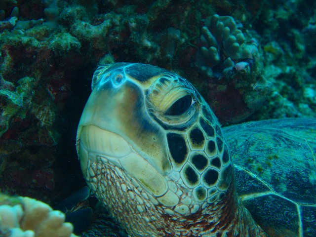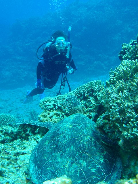 まずは、船から飛び込んだ途端、大きなアオウミガメ発見!眠いのか、じーっと動かないので、ファンダイビングチームはゆっくり同じ目線で。体験ダイビングチームはスノーケリングで水面から、見ることができました。