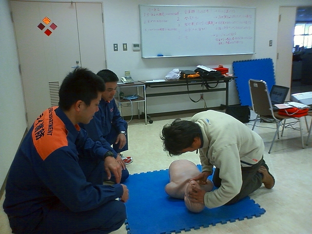 何回も何回も、心臓マッサージと人工呼吸、それからAEDを使った心肺蘇生法の練習をしました。現場に一人だけではない時を想定して、二人以上でチームワークを組んで行う場合の練習もし、保安庁の方や消防士、それからお医者様に監督されながらなので、細かいいろんな質問もできたので、とっても為になりましたよ!