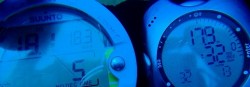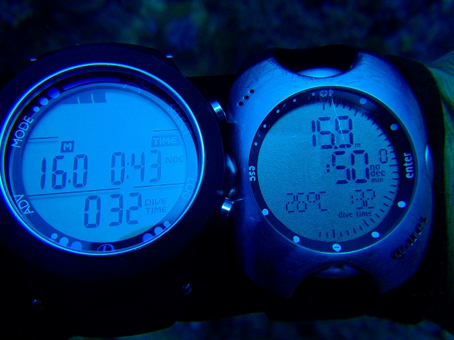 僕のDCが表示した水温は26度。まだまだ十分暖かいですね。 ナイトロックスモードに切り替えたモスキート(白)、エアモードのままのモスキート(青)、IQ700の3台を陸でのプランモードや水中での減圧不要限界を見比べたりしながら潜ってきました。