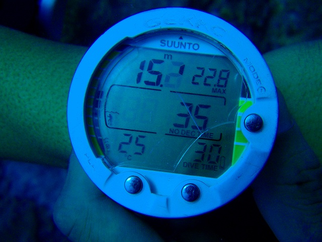水深は約14m。潜水開始から28分が過ぎた頃の表示です。